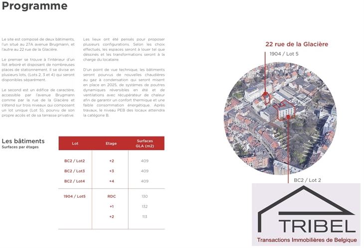 SAINT-GILLES limite Ixelles (quartier MA CAMPAGNE), non loin de la place Stéphanie et de l'avenue Louise, magnifique plateau de bureaux rénové de 409m² offrant une variété d'implantation possible. Actuellement le plateau se compose de bureaux en open space et de salles de réunion séparées, de toilettes H & F, salle de douche et d'une cuisine full équipée. Possibilité de louer des emplacements de parking extérieurs pour 120€/mois et/ou des garages box pour 170€/mois. Mise à disposition d'une salle de fitness (au RDC de l'immeuble) pour les locataires des bureaux (inclus dans le loyer). Loyer annuel: 102.492€*. Garantie locative de 6 mois de loyer. Libre le 1er juin 2026. Pour conditions et visites: 02 344 88 84 / rent@tribel-immo.be / www.tribel-immo.be *Précompte immobilier (6,54€/m²) + charges (23€/m²) + taxes régionales (1,45€/m²) sont à charge du preneur.